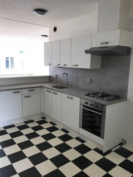 Totaal oppervlakte 56m2. Nieuwe keuken voorzien van koelkast, vaatwasser, gasfornuis met oven en afzuigkap. In de woonkamer en slaapkamer ligt laminaat, hal en keuken vinyl. Beneden is een berging beschikbaar.